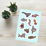 Included are the following animals, uniquely illustrated: Angler Fish, Axolotl, Blue Whale, Great White Shark, Jellyfish, Koi Fish, Sea Turtle, Squid, Sunfish, Tuna Fish.
