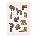 Included are the following animals, uniquely illustrated: Anteater, Armadillo, Coyote, Elephant, Hippopotamus, Lion, Mandrill, Meerkat, Red panda, Tiger.