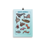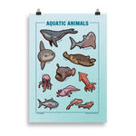 Included are the following animals, uniquely illustrated: Angler Fish, Axolotl, Blue Whale, Great White Shark, Jellyfish, Koi Fish, Sea Turtle, Squid, Sunfish, Tuna Fish.